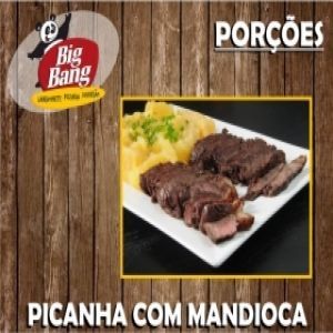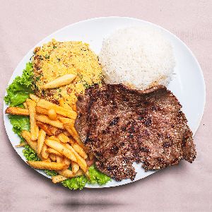 Filet mignon picado, Queijo mussarela, Batata palha, Banana assada com Canela e Molho especial